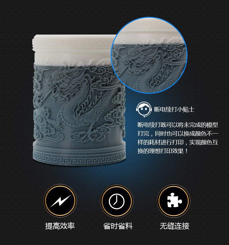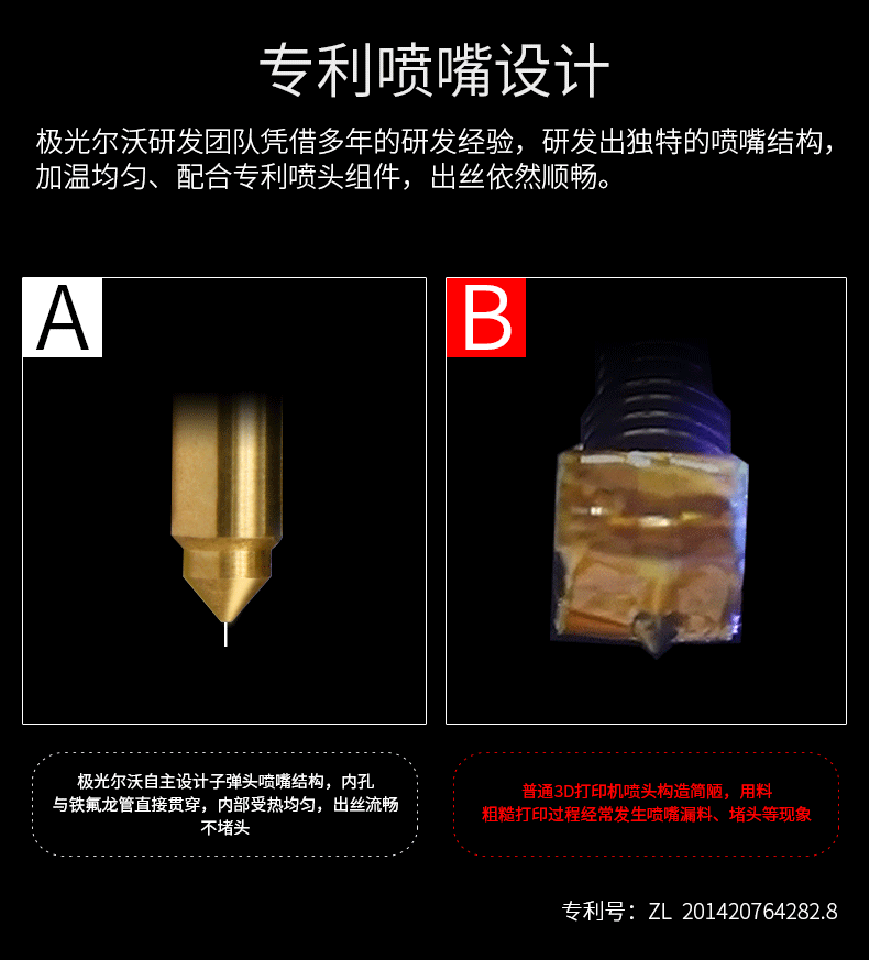 A8S使用了研發(fā)的專利噴頭,出絲更順暢,特殊的內部構型降低了堵頭風險,提高了30%以上的使用壽命。CNC加工一體成型的打印平臺,平整度更高,能夠有效提高噴頭的準確定位。雙擠出機同步擠出,能夠保證擠出順暢,同時也降低了單擠出機容易出現(xiàn)的斷料風險,對于中途更換材料也有極高的便利性。