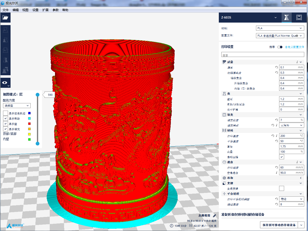拖動分層預覽滾動條,軟件可以根據參數值,展現每一層的圖像。我們知道FDM打印技術原理,其實就是通過一層一層的材料堆積來實現整個模型的成型。通過預覽,你可以直觀地觀察到模型是怎樣一層一層生成的。